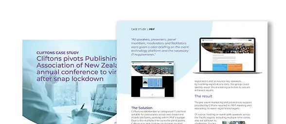 Publishing Association of New Zealand (PANZ) had its annual conference booked with Cliftons. The event was scheduled as a hybrid, with 100 attendees attending onsite and multiple keynote speakers joining virtually. But with a snap lockdown announced, a rapid shift to an entirely virtual event was needed.